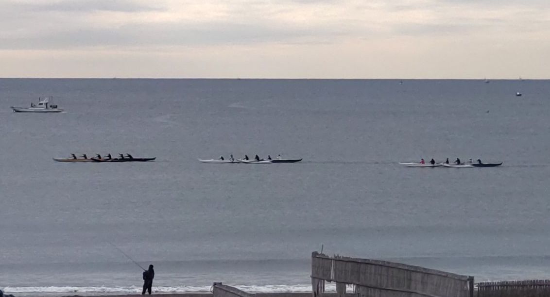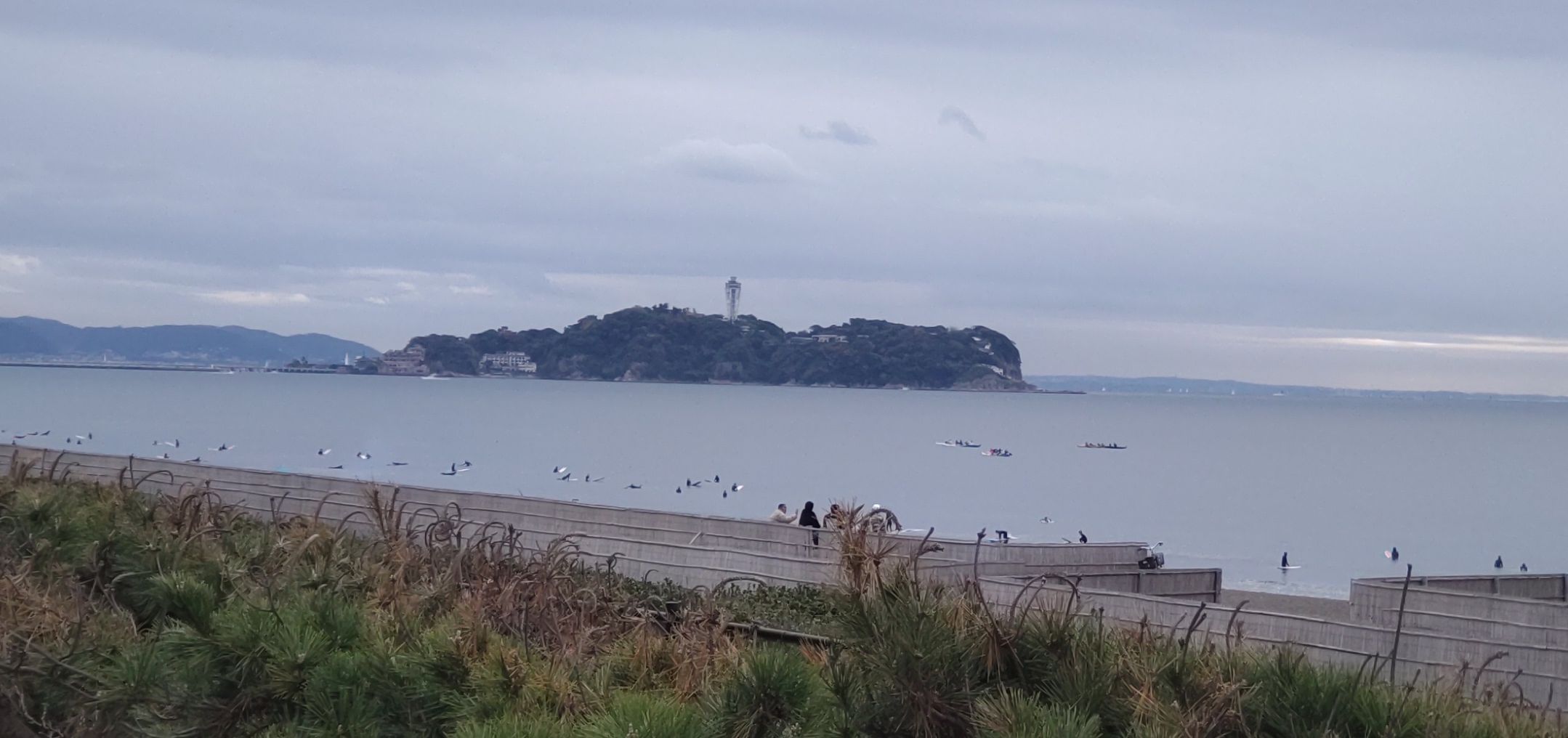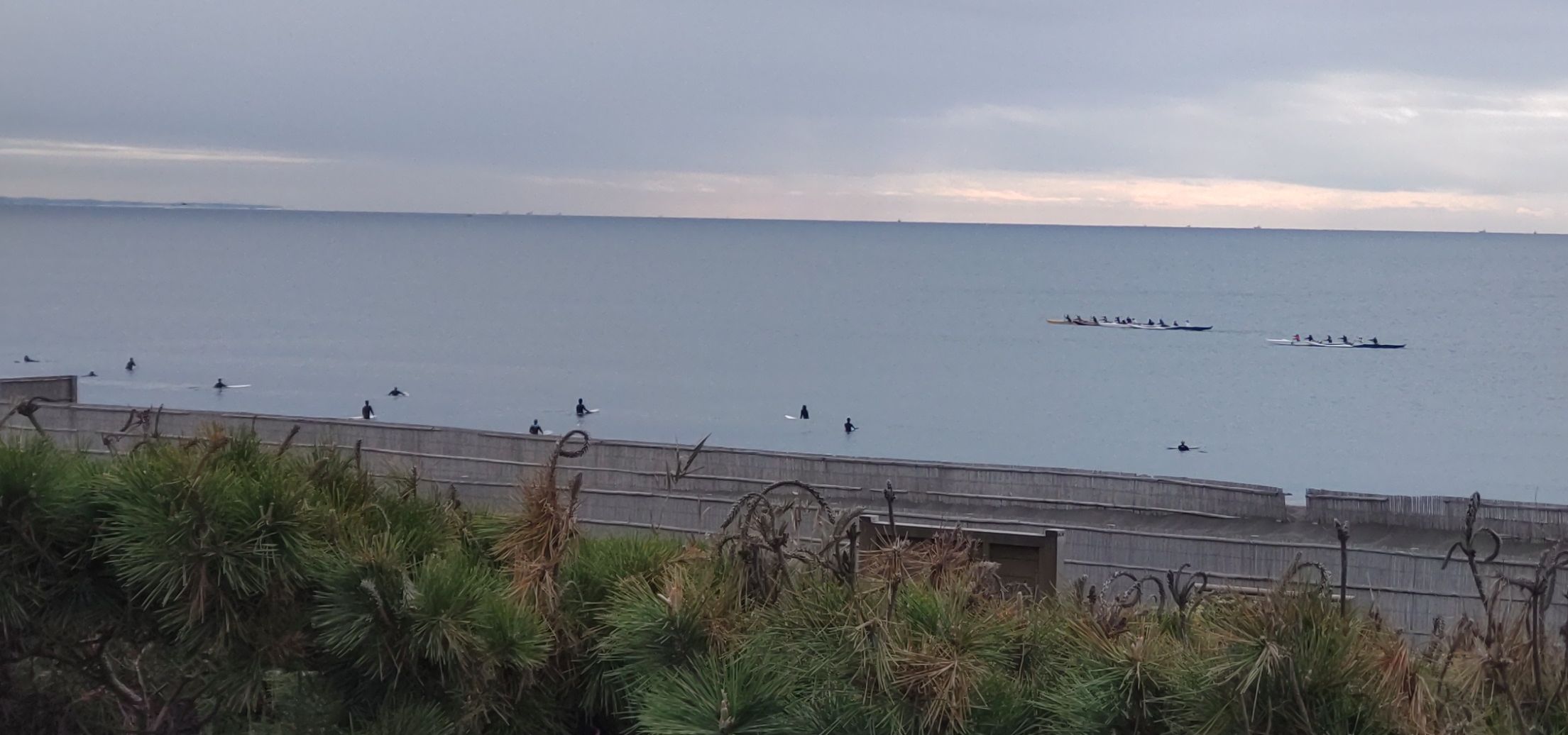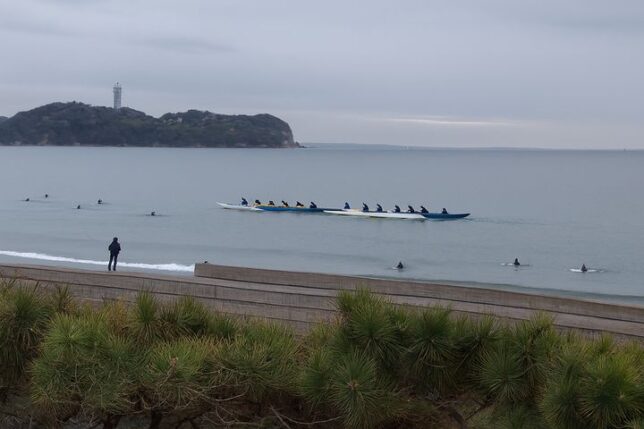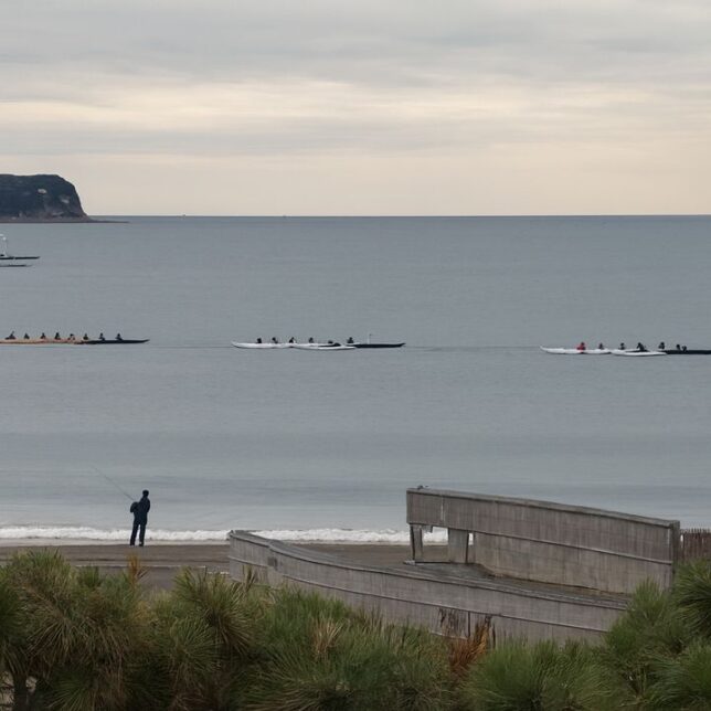 松林を抜けた展望台からの眺め。 海には6人乗りの三艘のカヌーが並び、まるでパラオの島からやってきたかのように静かに、でも力強く進んでいる。 サーファーたちは波乗りを忘れ、ただただ見とれていたんだって。 釣り人が海岸に立ち、江ノ島が遠くに姿を現す。時間は10時25分から42分のあいだ。 まるで夢のような、でも確かにそこにあった朝のひとときだね。