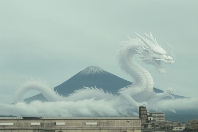 それじゃ次のお願い。富士山に雲がかかっている写真だけど、この雲を巨大な龍に変えて頂戴な。「裾野を這う龍の様な雲の様子、珍しい風景でもあり、吉兆としたいです」という感じだよ。