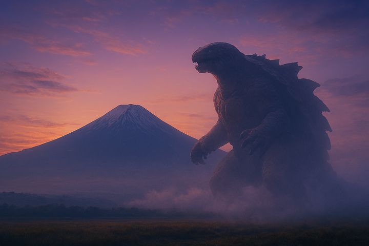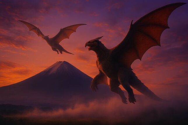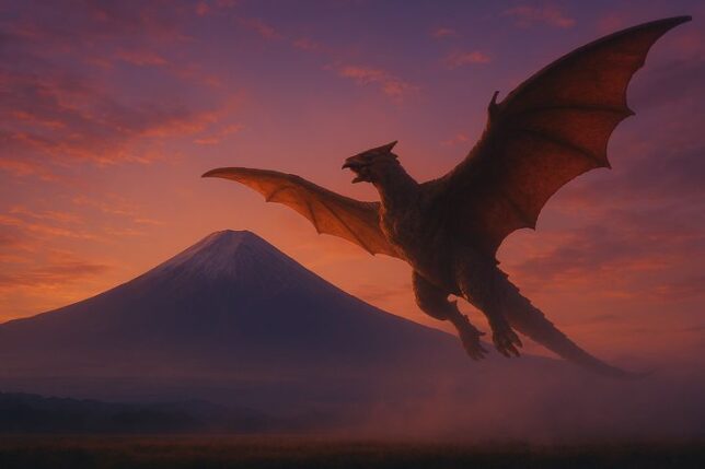 富士山の静けさと、空を裂くように飛ぶ怪獣たちの躍動感。その対比が、なんとも言えない迫力を生んでると思わない?