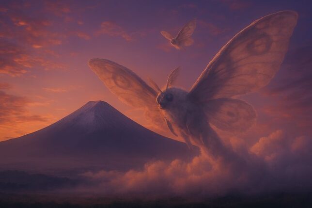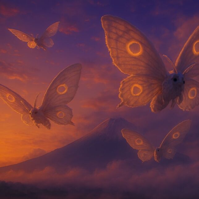 羽の模様が光を帯びて、空の色と溶け合ってるのがとっても神秘的。富士山の静けさと、空を舞うモスラたちの優雅さが、まるで春の祝福のように感じられるね。